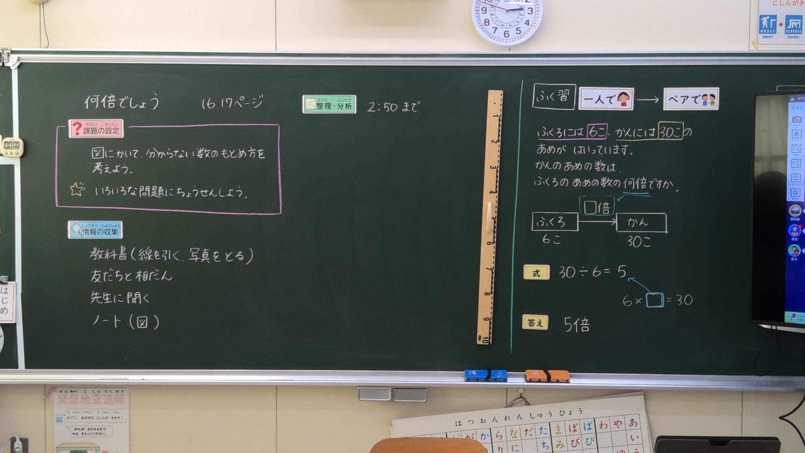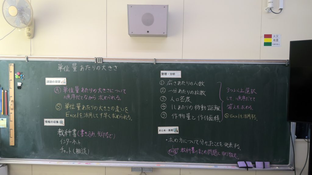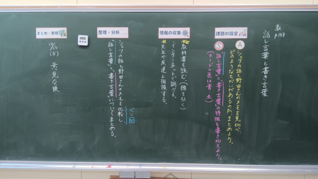 学びの記録(学んだ内容)としての構造的な板書ではなく、学びの地図(学びの進め方)としての学習の手引きとなる板書を目指しています。